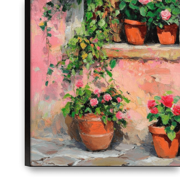 A soft, pink-coloured wall embraces a nostalgic window, surrounded by lush greenery and bright floral units. Blooming geraniums in clay pots add a touch of vibrancy and freshness to the view. The light plays softly on the wood, while the plants touch the heart with their colourfulness and grace. Inviting and full of life!