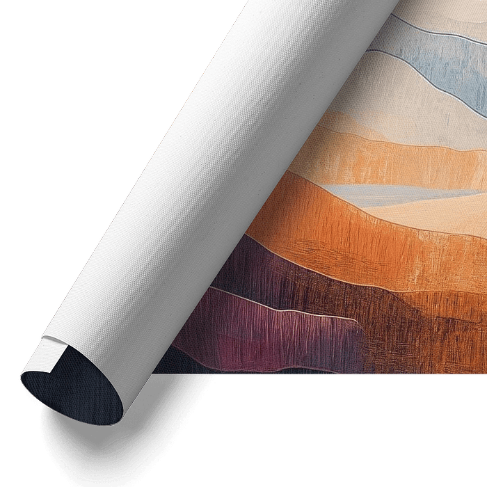 An enchanting abstract mountain landscape in which warm orange and peach tones harmoniously merge with cool turquoise and indigo blue tones. The flowing lines and soft transitions create a dreamy, almost mystical atmosphere reminiscent of a sunrise in a mountainous area, captured in a modern, minimalist style.