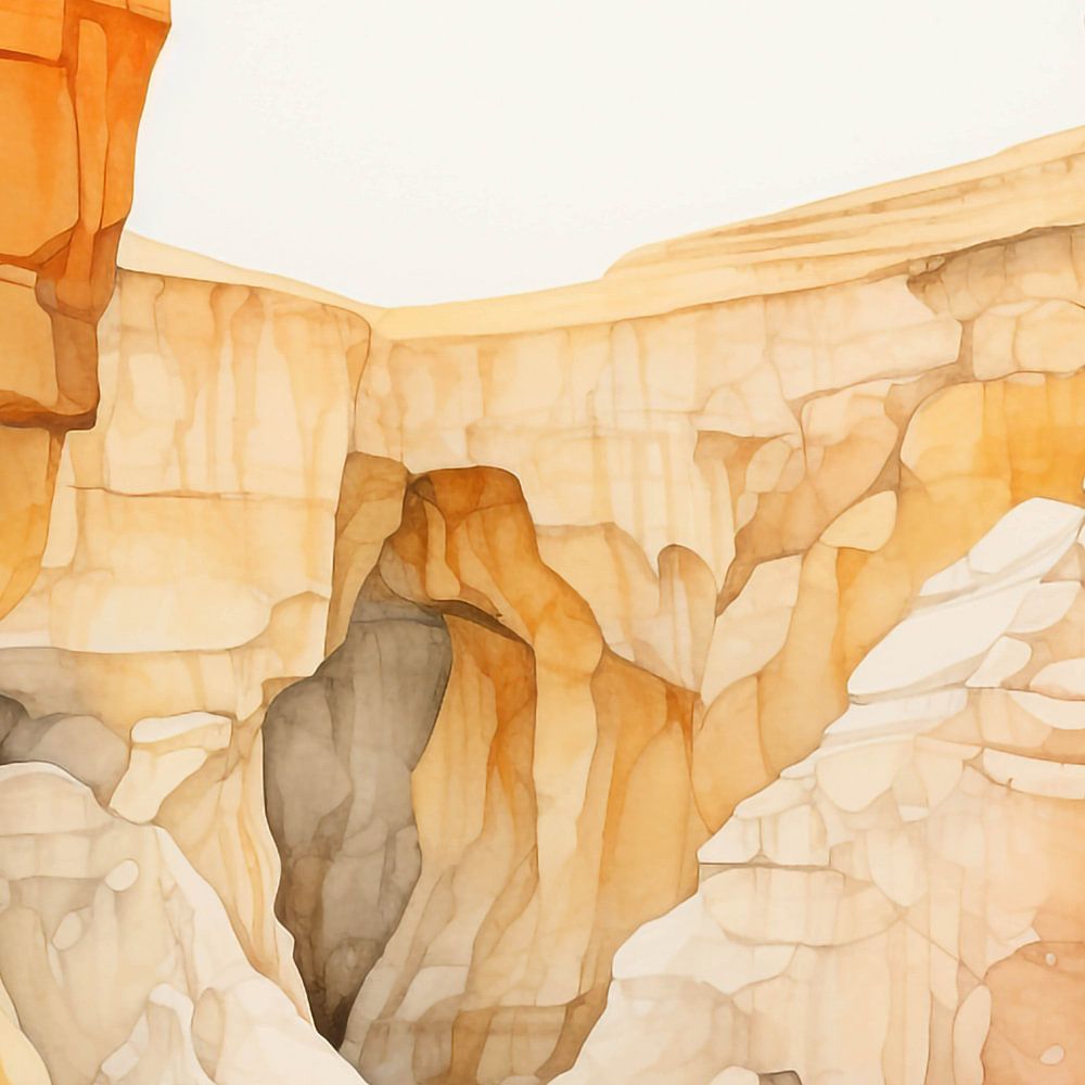 This beautiful watercolour painting depicts a deep, desolate desert canyon in a painterly style of pale white and light orange tones. Resembling a web-based art creation, it exudes a sense of serenity and desolation.