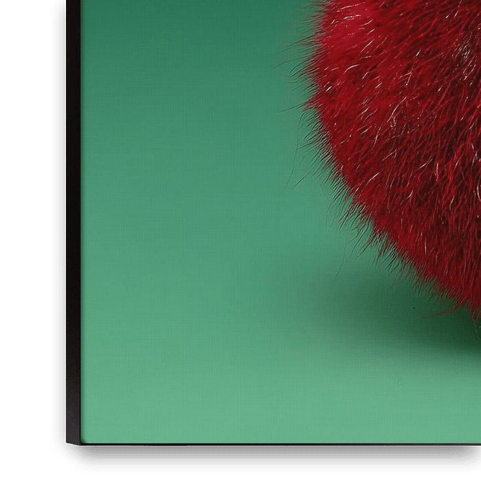 Two cherries with dense, soft fur lie next to each other on their stems against a lush green background. The bright red of the fruit is emphasised by the fluffy surface and looks particularly lively in contrast to the fresh green. The unusual texture of the cherries is reminiscent of fine animal fur and lends the familiar fruit a…