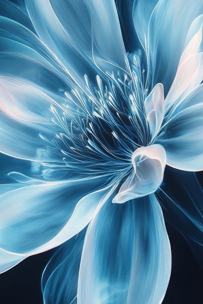 "Fluorescent Blue" captures the essence of an ethereal flower in radiant shades of blue, framed by a deep black background. The semi-transparent petals seem to glow from within, with soft accents of pale pink adding a delicate contrast. The flowing lines and layering create an almost dreamlike feel, making this artwork perfect for modern spaces that crave an atmosphere of serenity and mysticism. Ideal for lovers of abstract nature art and elegant, subtle colours.