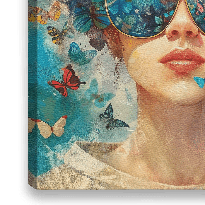 Fluttering Mystery - This surreal female painting shows a young woman whose face is partially covered by butterflies, with a pair of butterflies reflected in her sunglasses.