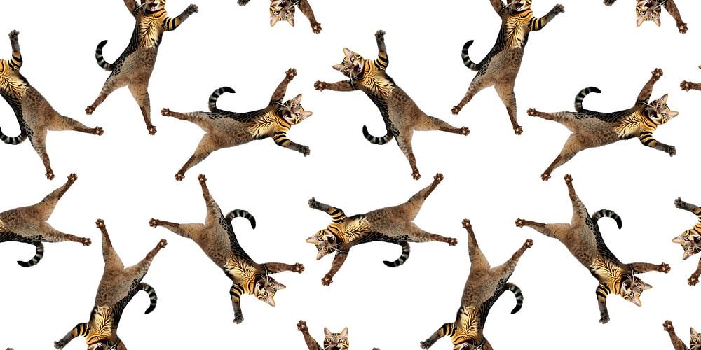 Tableau of cats flying through the air with all legs spread trying to land properly. The cats appear to be composed of several felines.