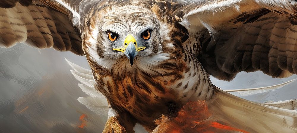 Flying Majesty - This impressive painting shows a powerful bird of prey in full flight, with a detailed rendering of the feather structure and an intense look in the eyes. The artistic style leans towards realism with energetic brushstrokes, giving the animal dynamism and vibrancy. The colour scheme is predominantly in shades of brown with subtle accents of orange and yellow, which blends beautifully with the soft grey tones in the background.