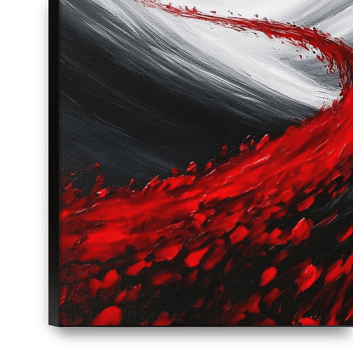 This intriguing artwork shows a black bird soaring majestically above an undulating landscape. The contrast between the dark bird and the red strip that winds through the landscape creates a sense of dynamism and power. The flowing lines and subtle tones in the background create a serene atmosphere, while the red colour adds a dramatic…