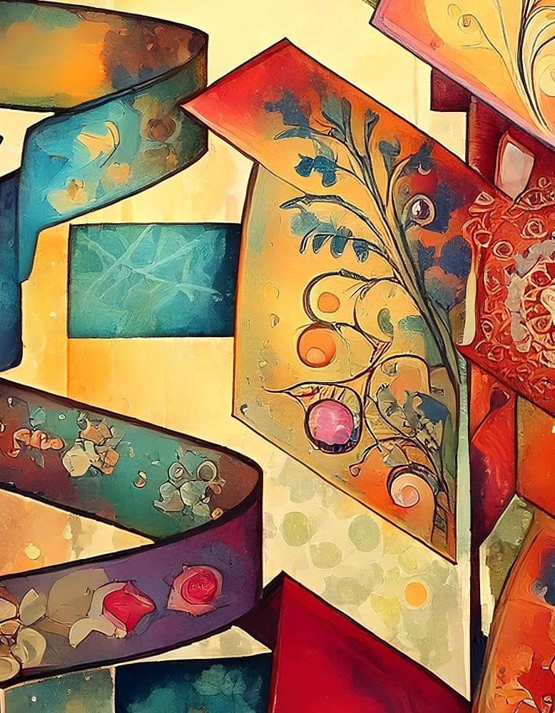 An abstract composition in which we can imagine a flight of very colourful greetings cards taking off towards their recipients. A ribbon stretches like a link between virtual correspondents. It's an abstract work in which the elements seem to be distributed randomly in a secret harmony underpinning this colourful collection of free forms.