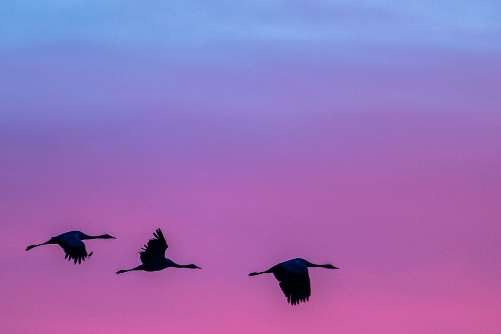 Flying cranes during sunrise