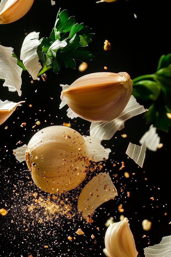 Amidst a dynamic explosion of fresh ingredients floats an artful interplay of herbs, nuts and delicate crockery. The vibrant colours and black background add dramatic depth to this arrangement. Perfect for the kitchen, this image will create a passionate atmosphere that can inspire any chef.