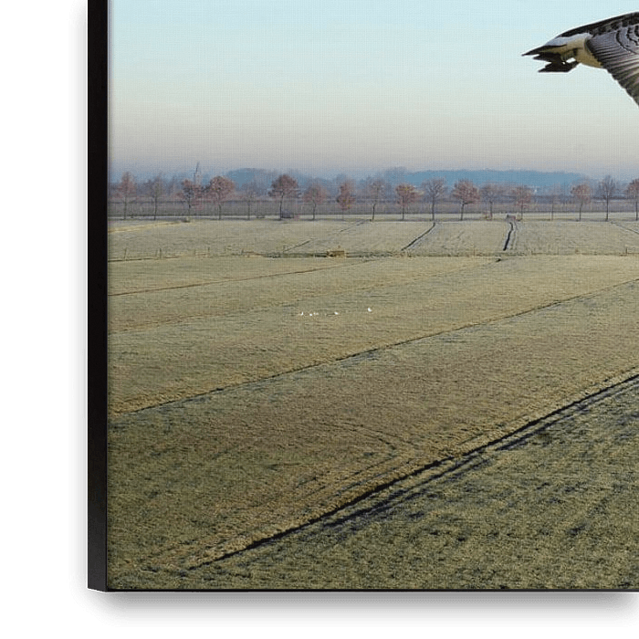 On a winter morning 3 barnacle goose fly over a winter meadow . Farmhouses and trees in the far distance
