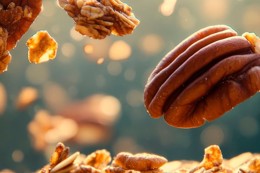 A delicious explosion of nuts and crunchy granola is created in this captivating moment of movement. The warm beam of light brings out the texture and lustre of the roasted pecans, perfect for creating an inviting atmosphere in the kitchen. An eye-catcher that whets the appetite and invites you to savour!