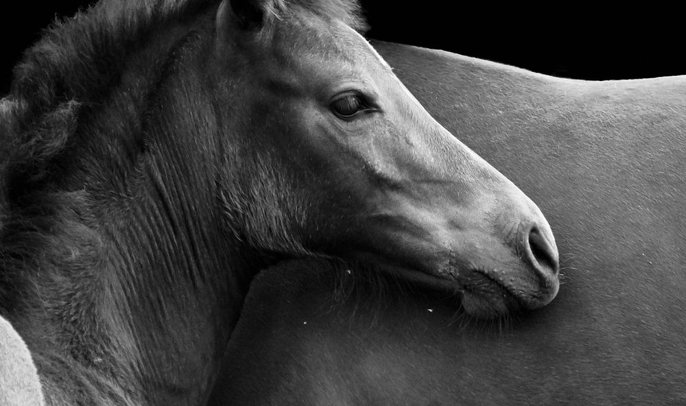 A foal stands in front of the mother horse mare. Two horses isolated in front of black background.