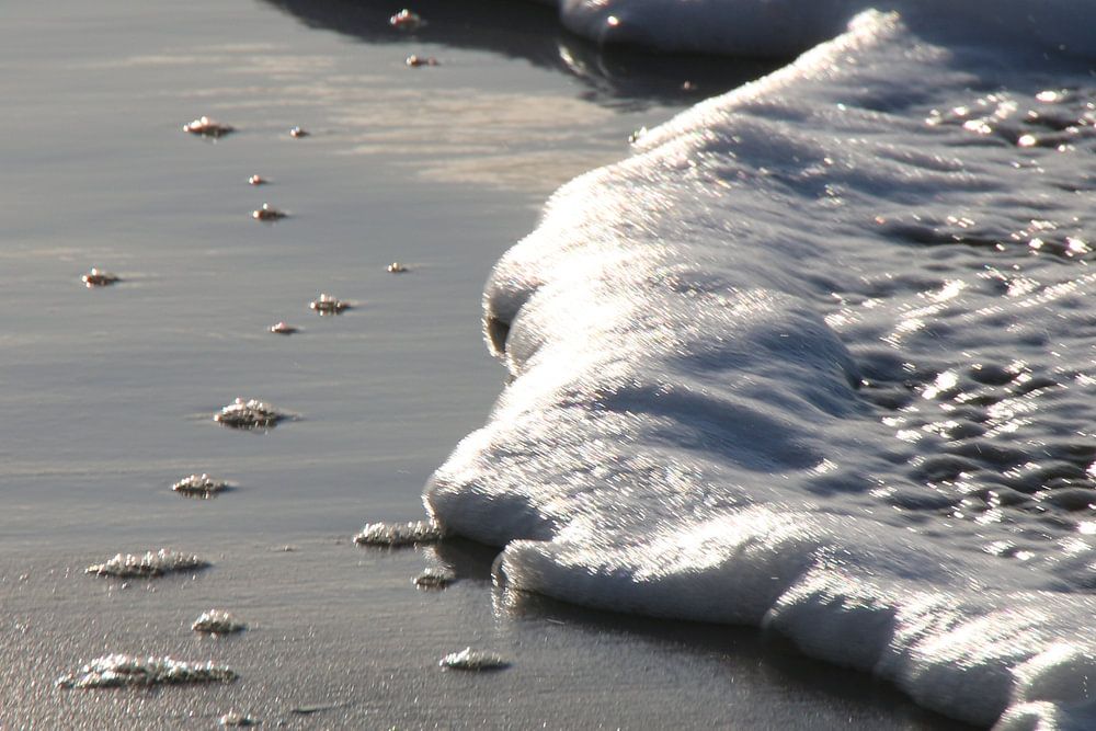 Foam of a wave running onto the sand of the beach in silvery winter sunlight, Callantsoog, The Netherlands