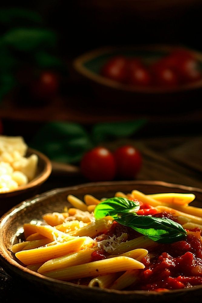 A highlight of Italian cuisine is served on the plate: golden pasta refined with bright red tomatoes and green basil leaves. The warm, rustic atmosphere and the soft play of light bring cosiness into play. This work of art is perfect for the kitchen or dining room and transforms the room into a backdrop for enjoyment and socialising.