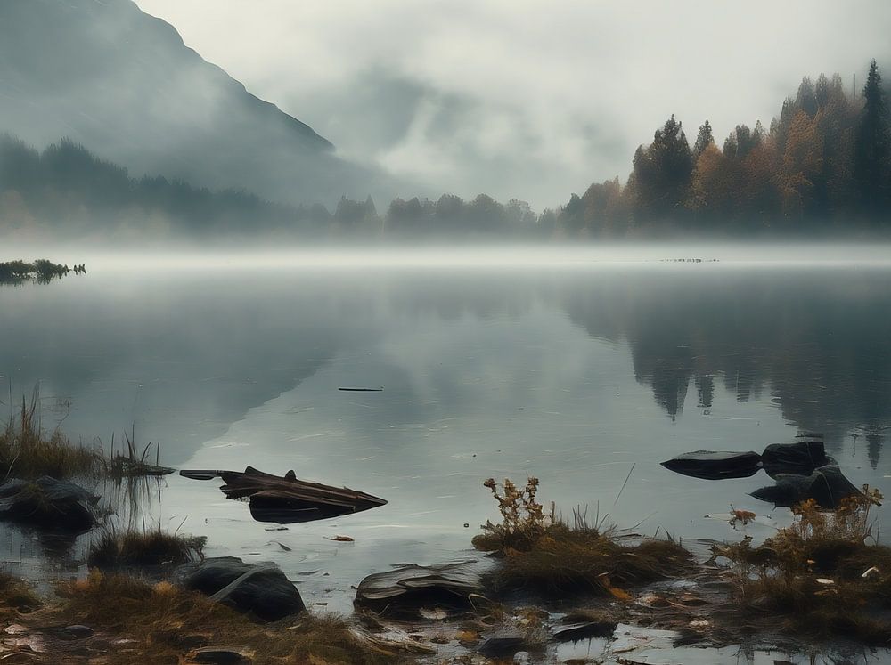 Buy this landscape artwork Fog at the mountain lake by fernlichtsicht on canvas, ArtFrame, poster and wallpaper, printed on demand in high quality.