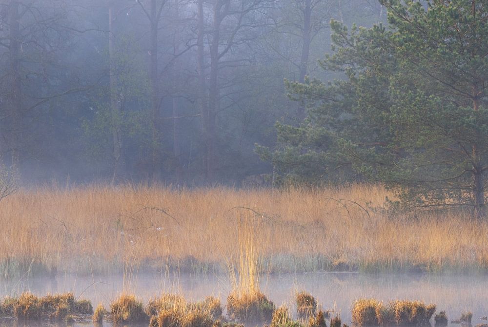 Buy this landscape artwork Fog during sunrise Dwingelderveld - Zandveen (Drenthe) Netherlands by Marcel Kerdijk on canvas, ArtFrame, poster and wallpaper, printed on demand in high quality.