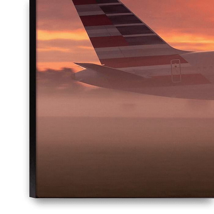 A foggy sunrise at Amsterdam Schiphol Airport creates a beautiful magical sky while this American Airlines 757-200 starts landing.
