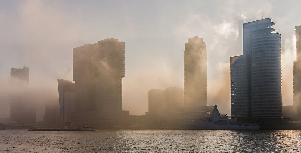 Buy this of Rotterdam Foggy sunrise above Rotterdam by Peter Hooijmeijer on canvas, ArtFrame, poster and wallpaper, printed on demand in high quality.
