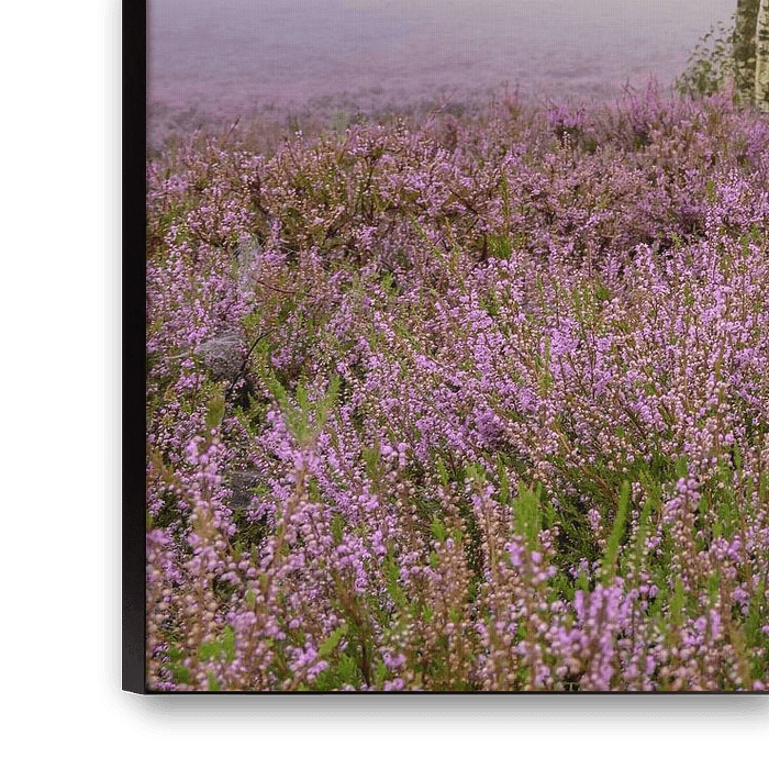 Sunrise over the blossoming common heather plants (Calluna vulgaris) in the Veluwe nature reserve at the Renderklippen heathland landscape during sunrise in summer.