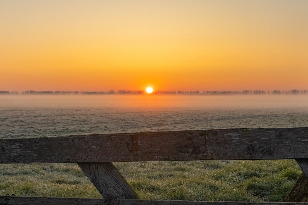 On my way to work, I pass this place. During the day a normal meadow, as there are many in the Netherlands. But when combined with a beautiful sunrise and fog overhead, called 'witte wieven' in the east of the country, this dead-normal meadow takes on a fairy-tale appearance. It invites you to walk through the raised fence towards the sun.