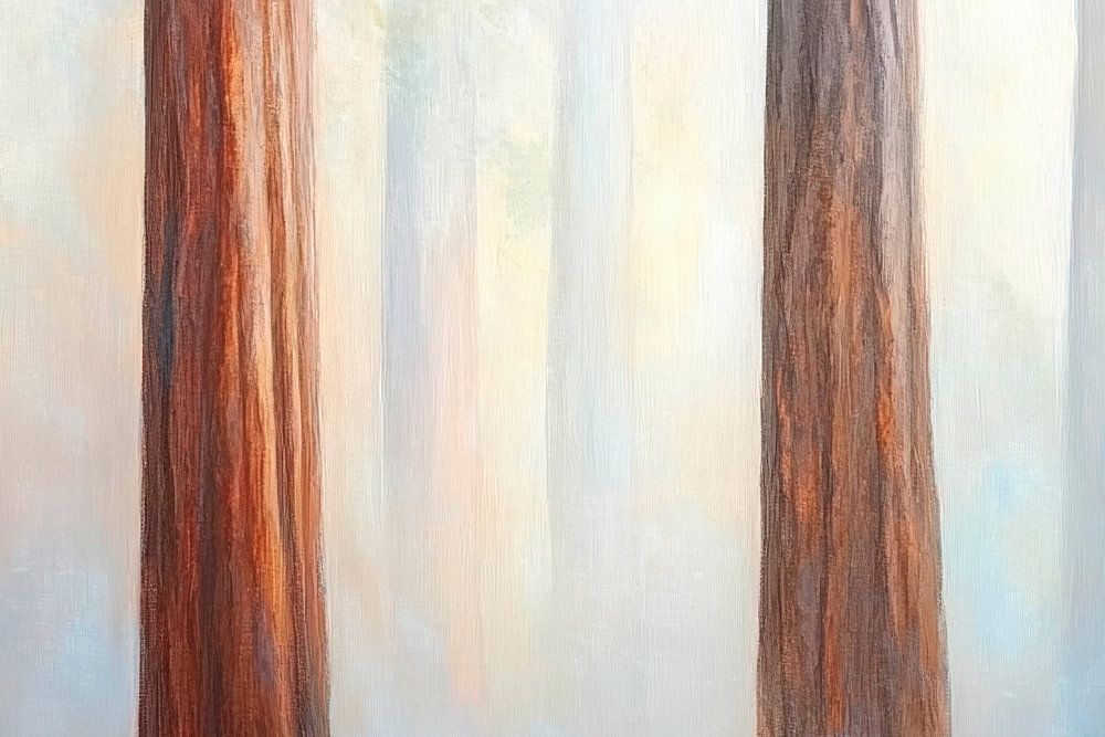 The majestic tree trunks rise powerfully out of a mystical mist, creating a mysterious atmosphere. The gentle play of light and shadow lends the room a calming elegance. Perfect for the living room, this work of art invites you to immerse yourself in relaxing thoughts or sociable conversations.