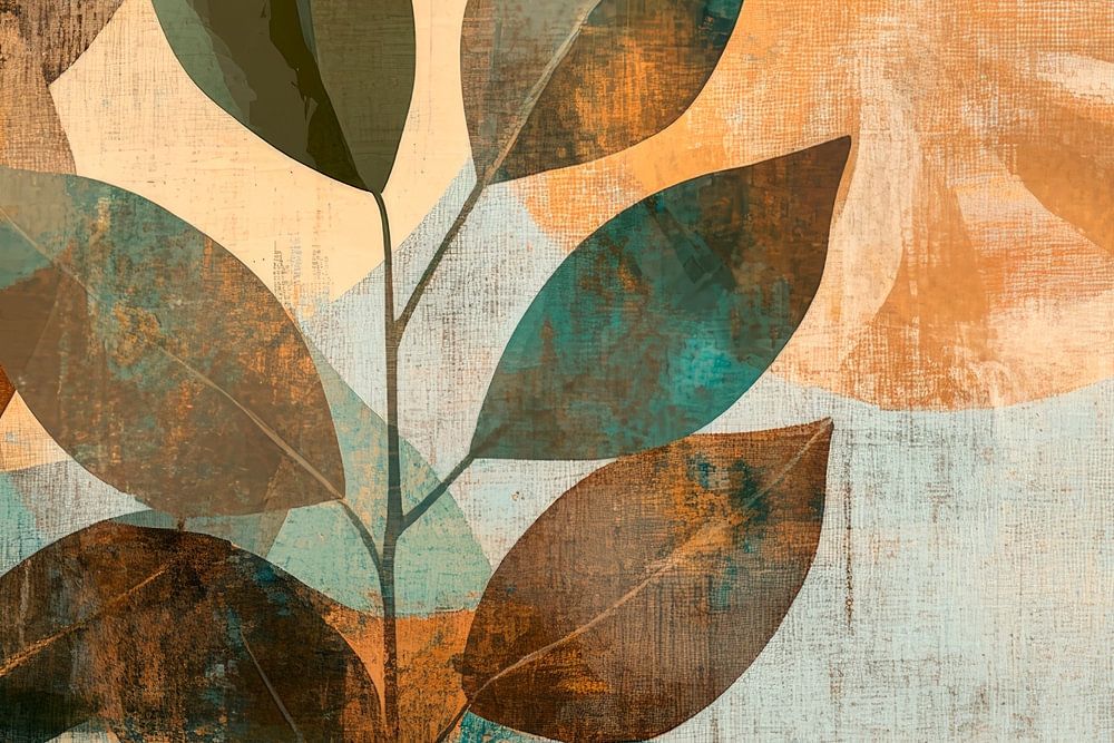 With soft earthy tones and harmonious shapes, this work of art exudes a sense of calm and naturalness. The stylised leaves and soft circles create an inviting atmosphere that fits perfectly in a living room or kitchen. The connection to nature is subtly captured here, ideal for relaxing moments.