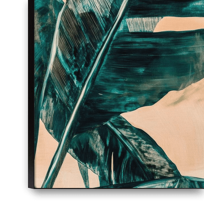 The powerful leaves unfold in a play of light and shadow, their deep green colours contrasting harmoniously with the soft beige tones of the background. The gentle curves and textured surfaces of the leaves draw the eye and convey a sense of calm and vital energy, as if nature itself is awakening in the room.
