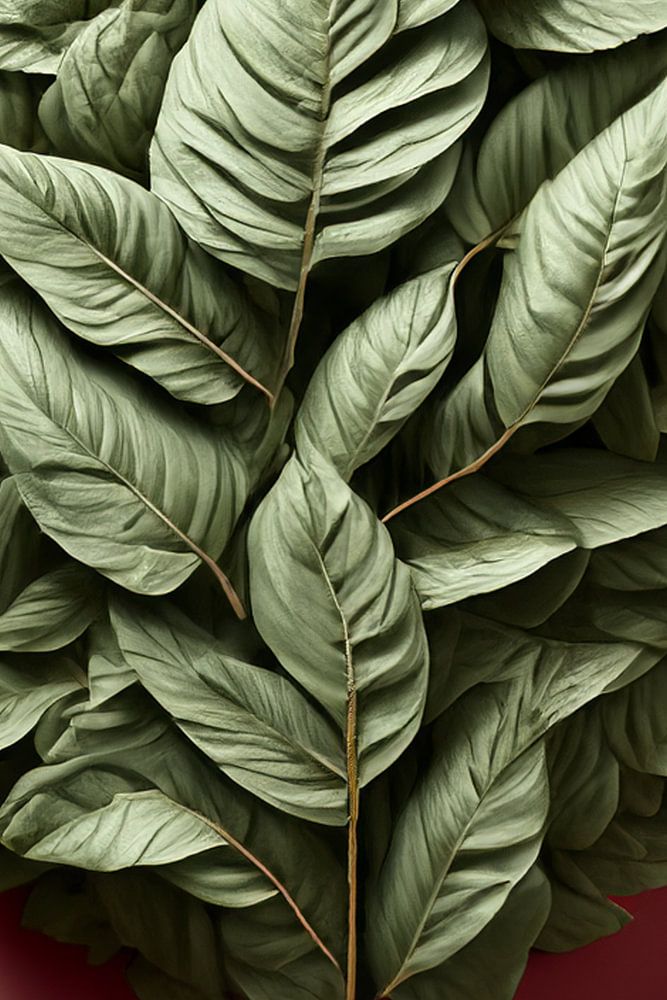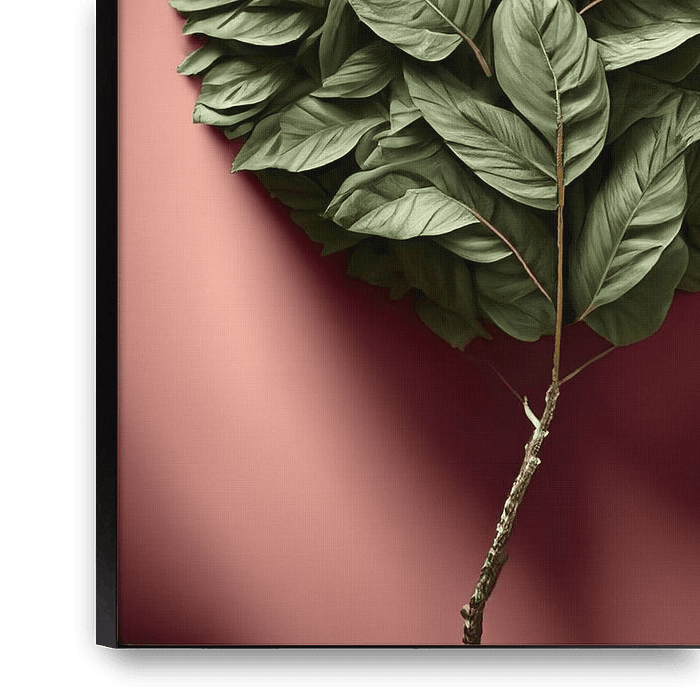 This artwork depicts a dense, organic formation of numerous leaves that come together to form a tree-like silhouette in the shape of a leaf – a natural tangle in rich forest green tones, interspersed with lighter shades of lime and moss to create a sense of vitality and depth. The background shimmers in a soft salmon pink, radiating…