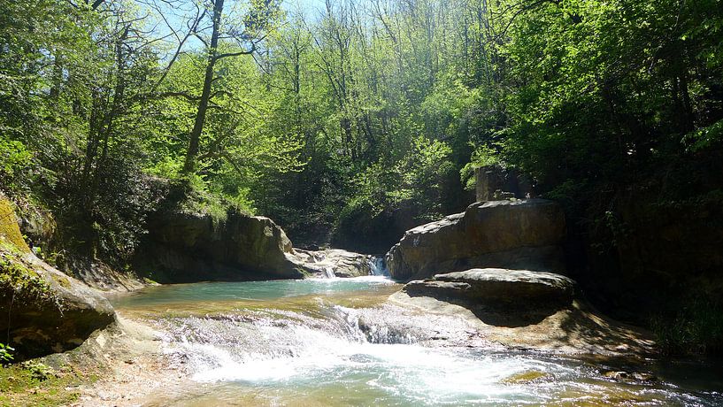 Een unieke stroom en watervallen in de buurt van Rennes-le-Chateau, Zuid Frankrijk. "Fontaine des Amours"