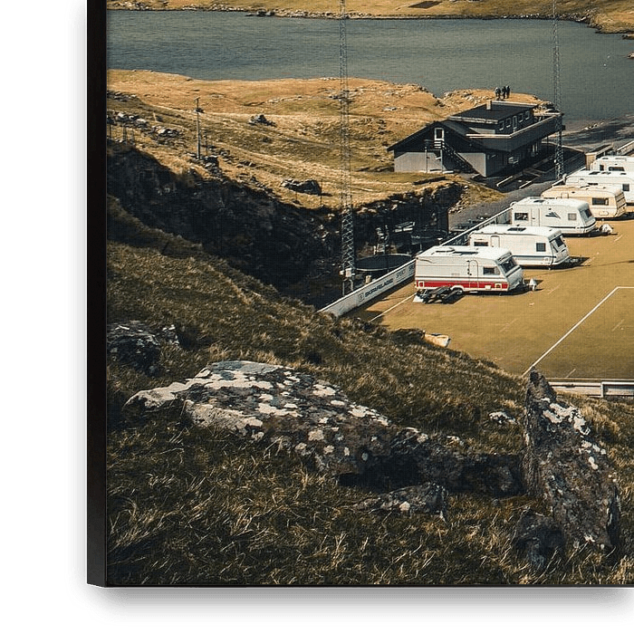 Buy the photo Football pitch with campsite on the Faroe Islands by Expeditie Aardbol on canvas, ArtFrame, poster and wallpaper, printed on demand in high quality.