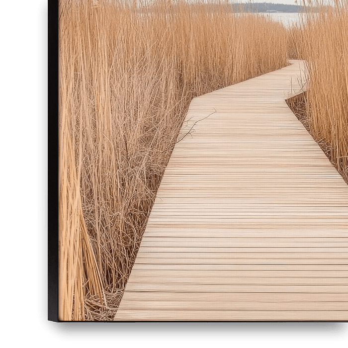 A narrow wooden footbridge unfolds in soft, earthy colours, leading mysteriously between tall reeds. The sky appears in soft shades of grey, while the natural beauty of the water at the end of the footbridge quietly beckons. Here, paths and nature merge into a harmonious invitation to explore.