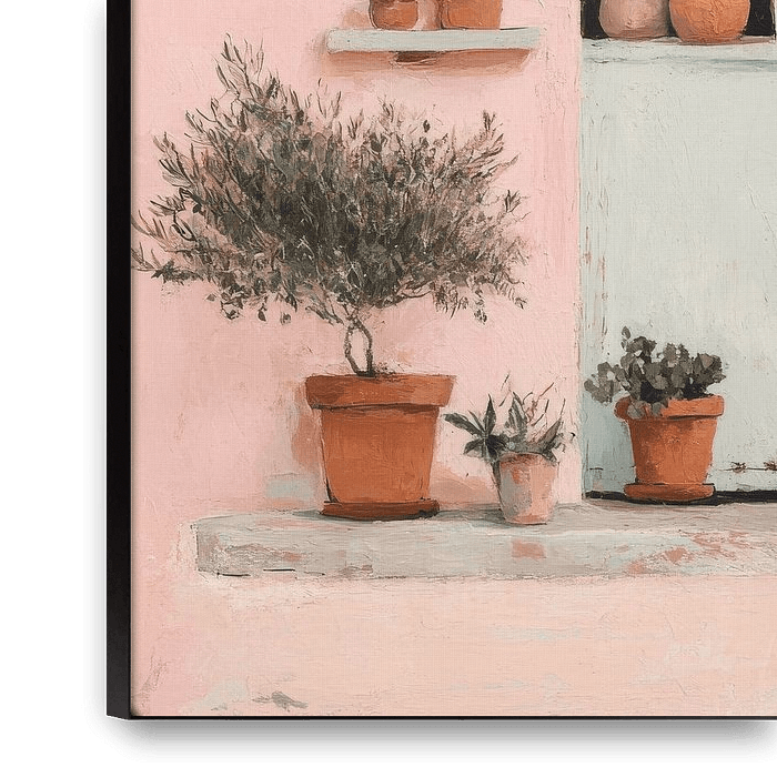 A stunning collection of potted plants nestled comfortably against a pink, weathered wall. The diverse textures and hues of the greenery create a harmonious chaos, as if each plant whispers: 'Look at me, I'm special!' Perfect for those who love a little nature in the urban jungle.