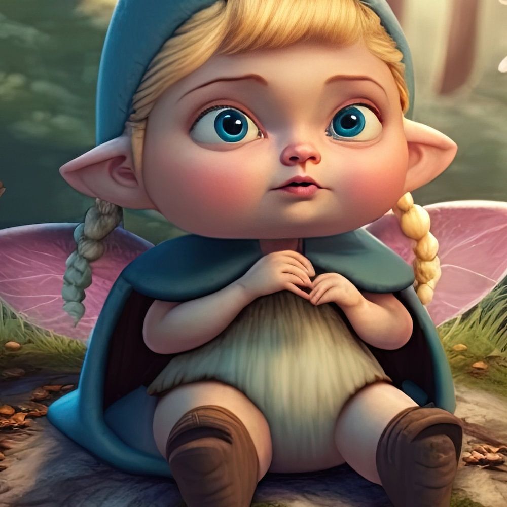 A sweet fairy child in a blue pointed hat looks into the world of Elves, gnomes, and fairies with big eyes amazed. She sits delightfully on a tree stump in the fairy forest watching all that flies, walks, and crawls.