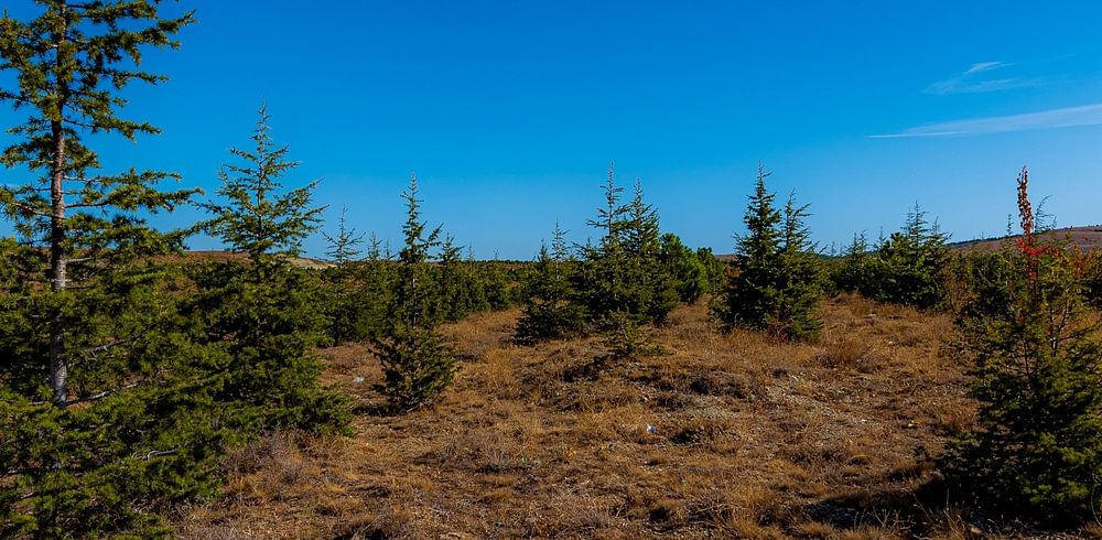 A freshly planted pine forest, busy surviving the drought.