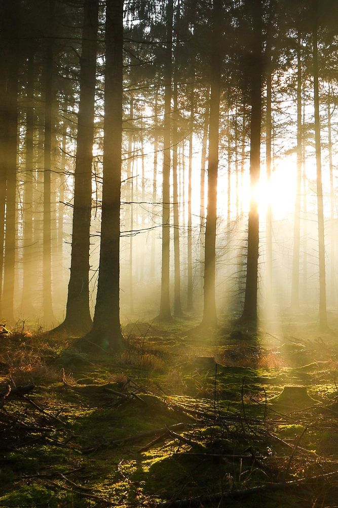 Sunlight through the trees in a forest. Warm feeling. Lord of the Rings atmosphere. Inspiration. backlight from the sun. Nice calming photo with different colours. You keep seeing something new in the photo.