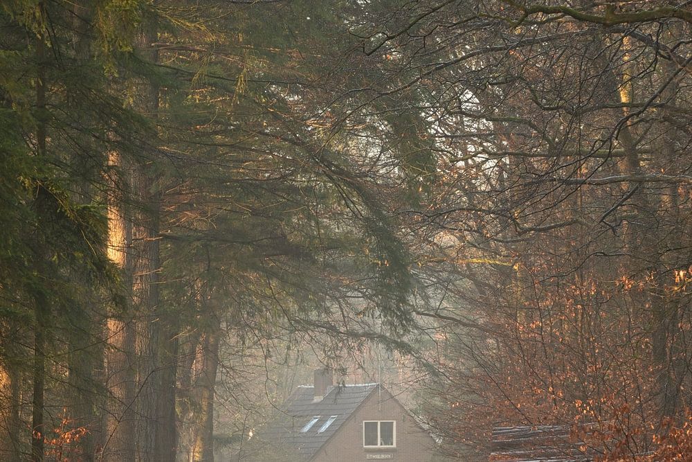In the picture, a road through the forest, with felled wood on the sides. You are looking out at B & B the Gemini in Schoonloo. It is misty, but the sun joins in and slowly chases away the cold and fog.