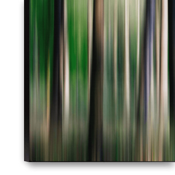 An impressionistic photographic work of a forest scene.