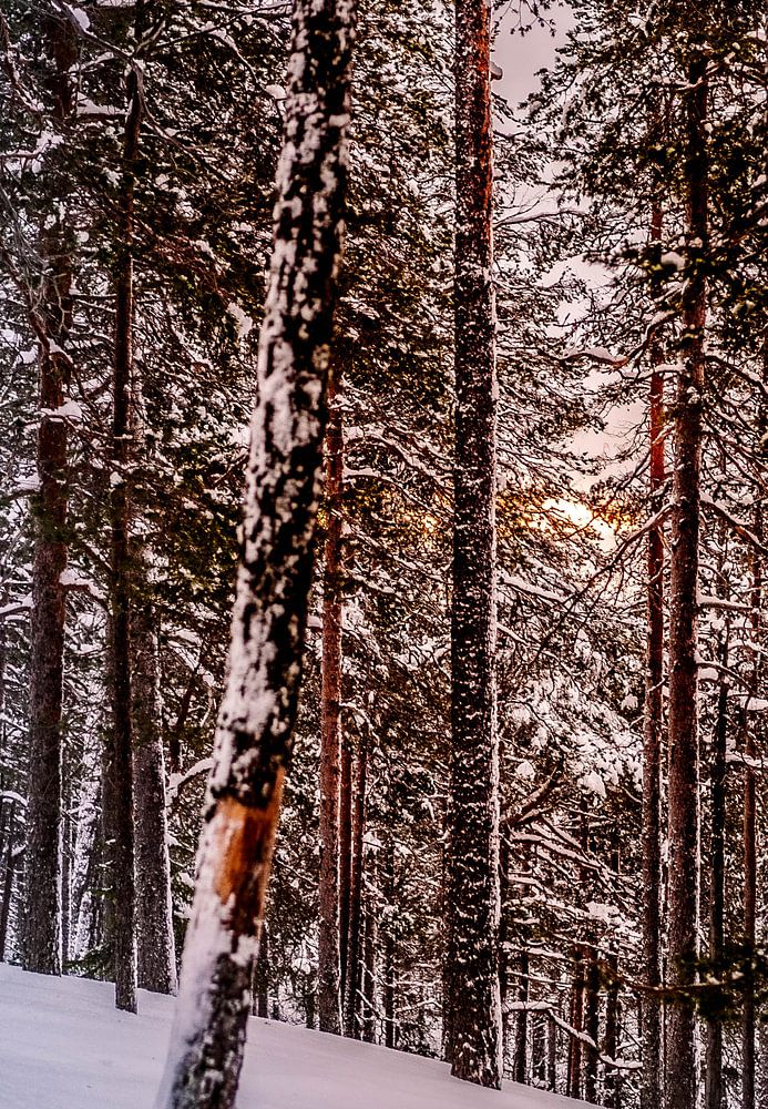 This picture was taken in the forests of Finnish Lapland. A beautiful environment, with minimal sunshine, but warm in color in contrast to the snow. It's like a painting.