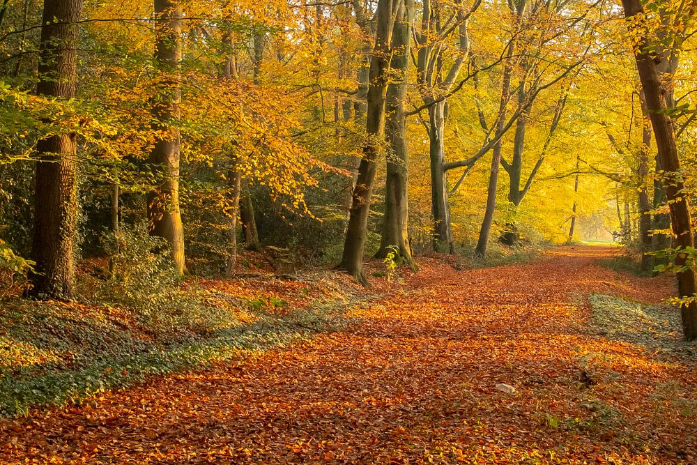 A forest in Autumn colors with a rising sun. Silence and warm colours are the most important features at this time of year.