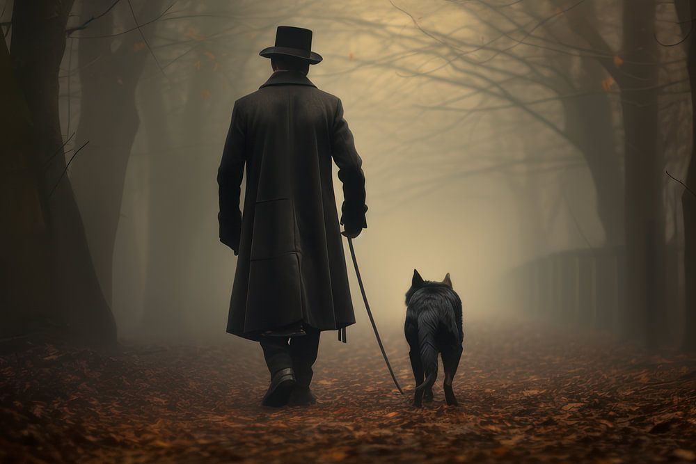 Silhouette of man and dog.