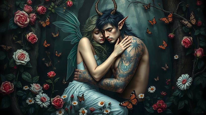 A forest nymph and a satyr in a dark fairy-tale forest full of roses and butterflies