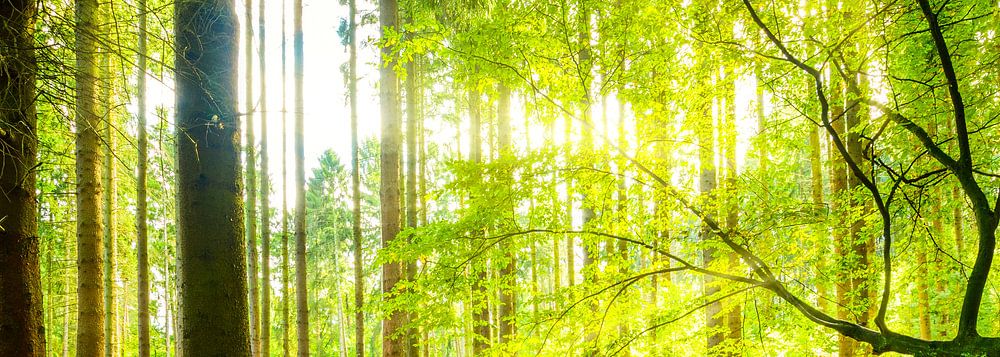 Buy the photo Forest panorama with sunbeams by Günter Albers on canvas, ArtFrame, poster and wallpaper, printed on demand in high quality.