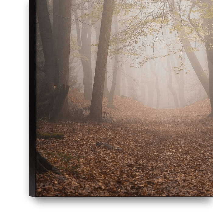 Fog in the great forest of Doorn near Utrecht. Soft autumn tones showing the leaves. Red forest floor through the fallen leaves.