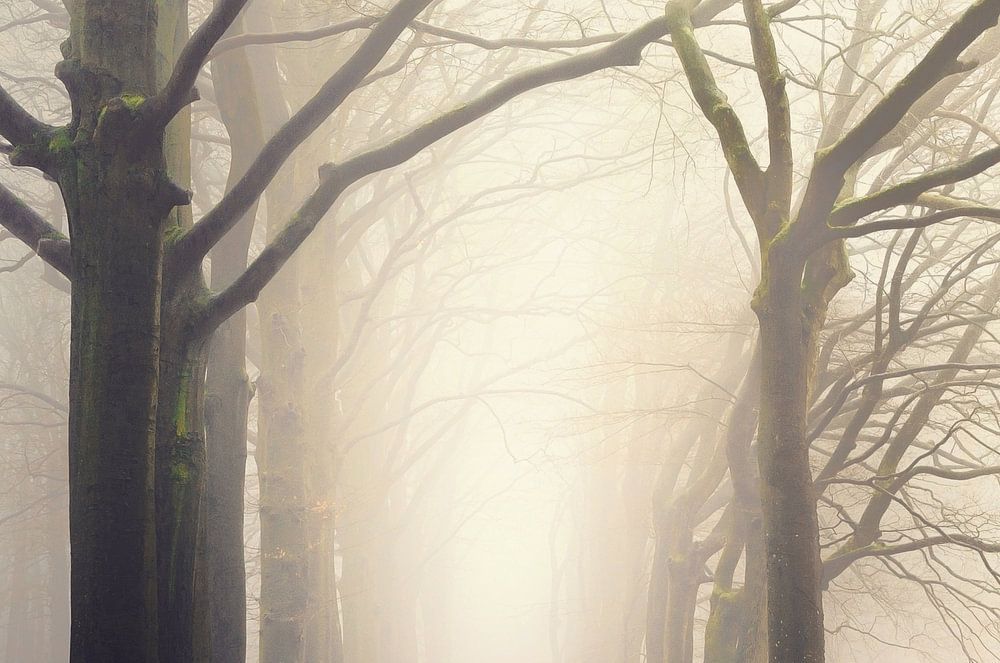 A road through a magical misty and warm serene forest in the Netherlands with pastel tones.