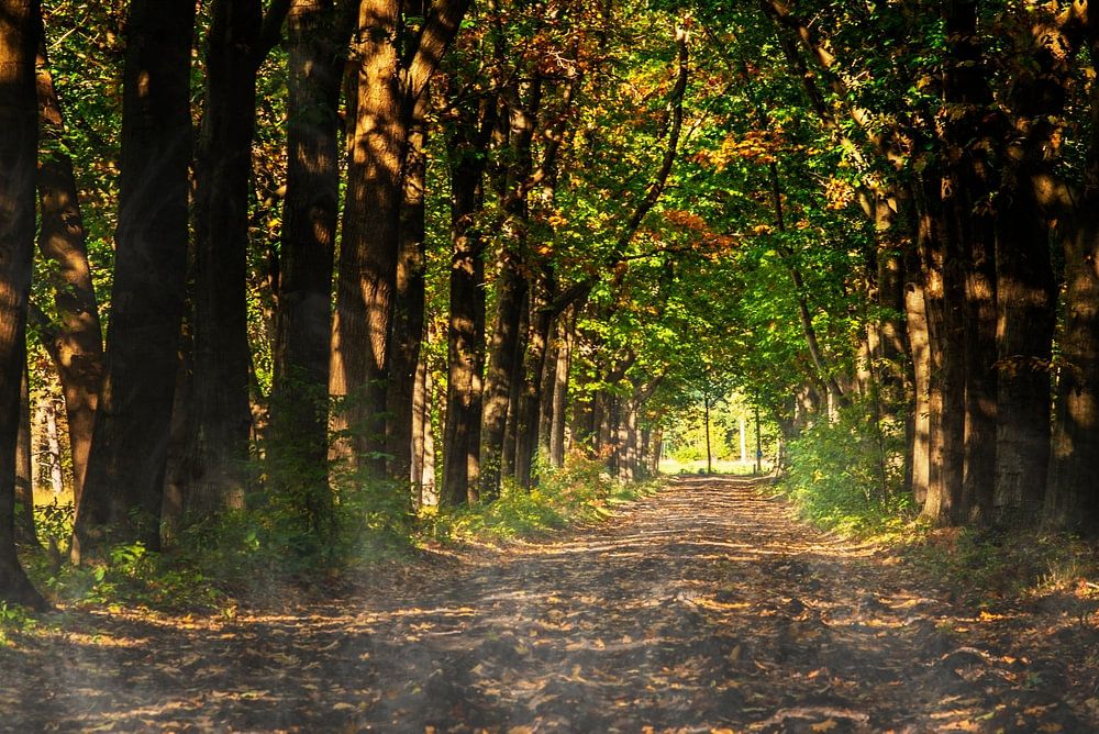 rising fog in the rising sun on this forest path with trees on both sides as far as the eye can see.