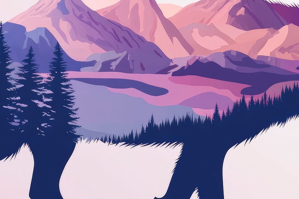 A majestic wolf strides through a dream landscape, its silhouette filled with gentle mountains and lush forests. The harmonious combination of nature and animal fable creates a calming aura, ideal for the living room. Here, every conversation finds an inspiring backdrop that invites you to dream and relax. Experience the power of nature!