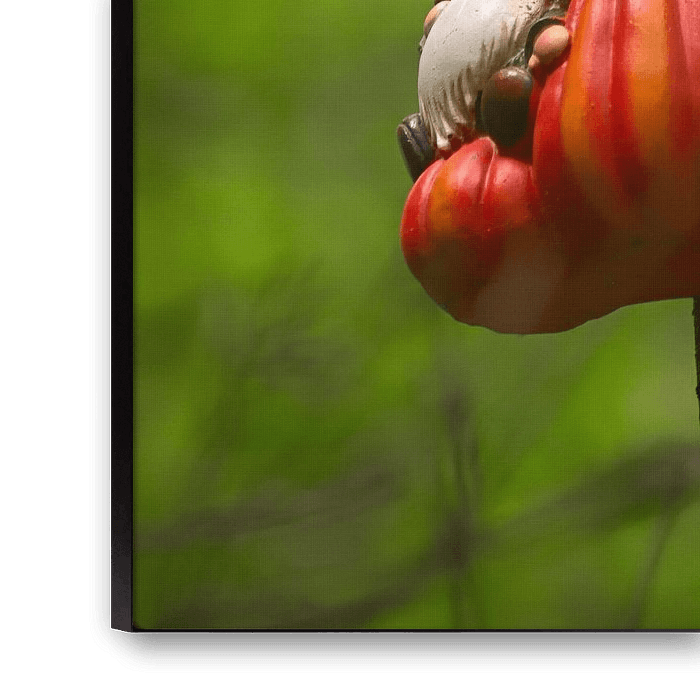 Against the trunk of a tree, enveloped by the soft green of the forest, a small gnome rests on a brightly coloured pumpkin. His presence seems almost unnoticed by the world around him, but there is a touch of magic in his silence. The bright hues of red and orange stand out against the cool moss green, as if nature itself were smiling for a moment.