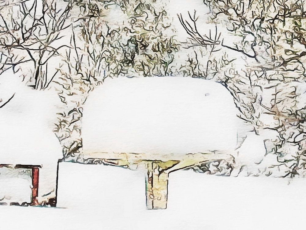 A few years ago, we awoke one morning to heavy snowfall. Although the climate is mild here in Central Italy, sometimes the winter can surprise you! I loved this view of a picnic area covered in a large amount of snow (forget the picnic Mom!). Behind can be seen rows of olive trees going up the hillside. I think the skeletal tree branches hanging into the scene just complete the picture don't you?