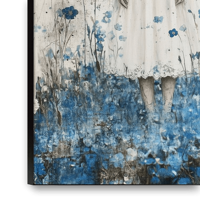 Buy this flower art Forget myrtle; girl in white dress in flower field of blue forget myrtles by Bianca ter Riet on canvas, ArtFrame, poster and wallpaper, printed on demand in high quality.