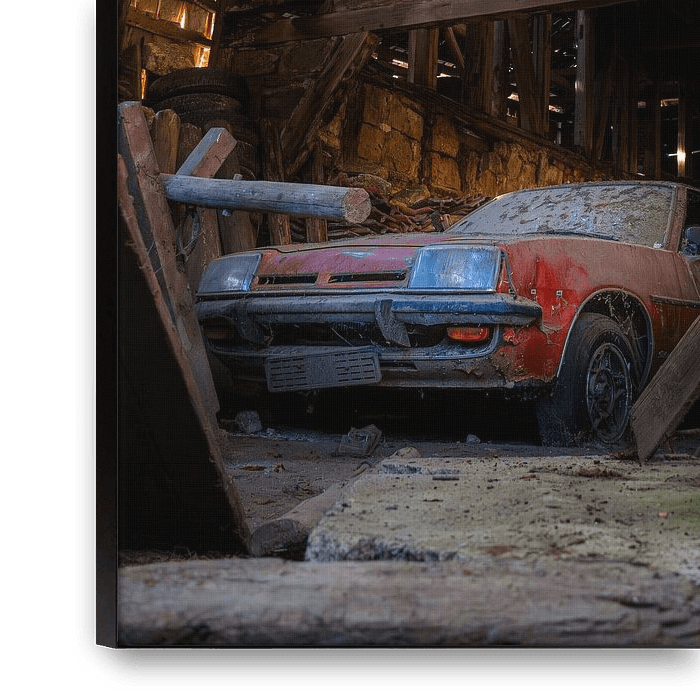 In a dilapidated barn, surrounded by creaking wood and crumbling brickwork, rests an old, rusty car - a silent witness to times gone by. The warm light of the sun streams through the broken roof tiles and casts fascinating shadow patterns on the weathered walls. The once bright red colour of the car is covered in dirt and rust, but it…