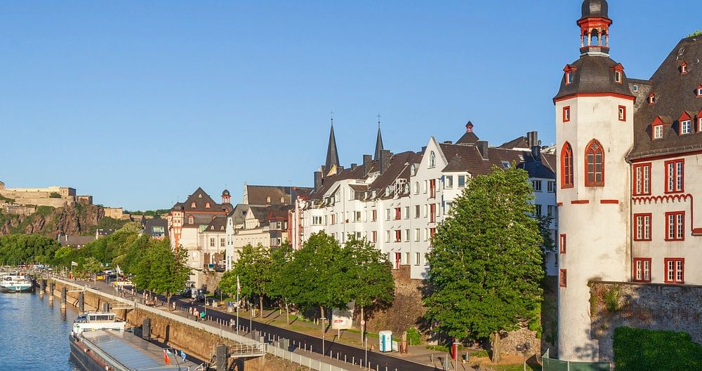 About "Fortress Ehrenbreitstein and Peter-Altmeier-Bank at the Mosel with old town in the evening light, Ko"
